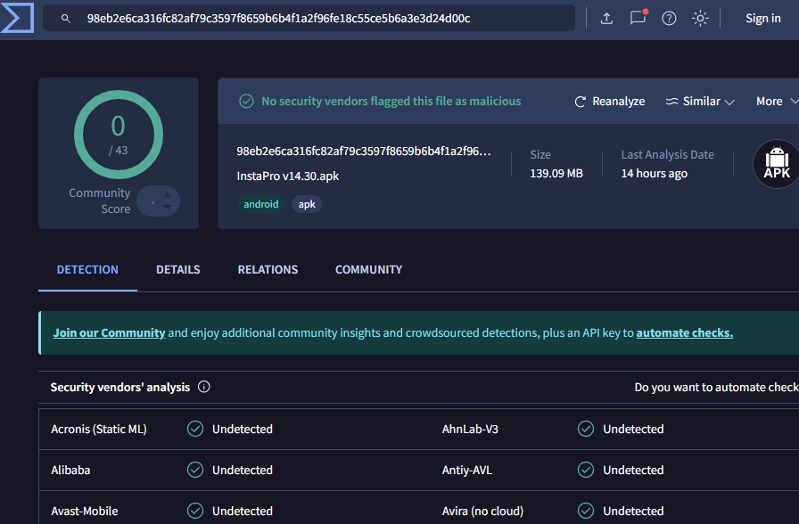 Well, I’ve looked at the 3 factors that can determine the safety measures of any app. Data leak, virus & malware, security, and compatibility of the app. Data leak is far from InstaPro; you can look at its beautiful community on various social platforms, as well as news on Google. I have scanned the latest InstaPro APK v14.20 on VirusTotal, and it passed with zero threats. Talking about security, it is the same as the official Instagram, like chats are encrypted, your account info can be accessed only by you, etc.
