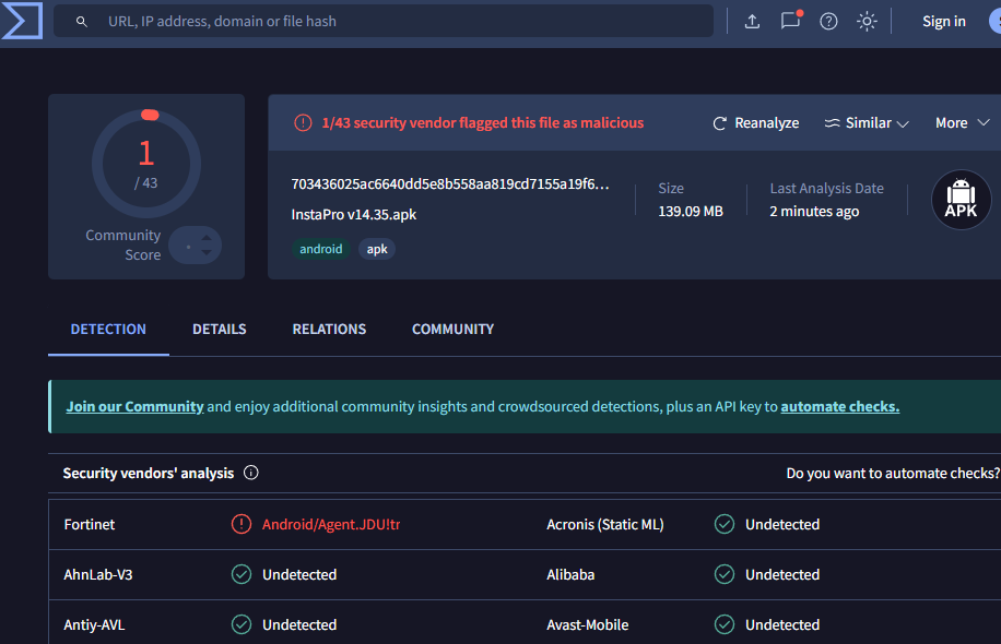 Well, I’ve looked at the 3 factors that can determine the safety measures of any app. Data leak, virus & malware, security, and compatibility of the app. Data leak is far from InstaPro; you can look at its beautiful community on various social platforms, as well as news on Google. I have scanned the latest InstaPro APK v14.35 on VirusTotal, and it passed with 1 minor threat. Talking about security, it is the same as the official Instagram, like chats are encrypted, your account info can be accessed only by you, etc.